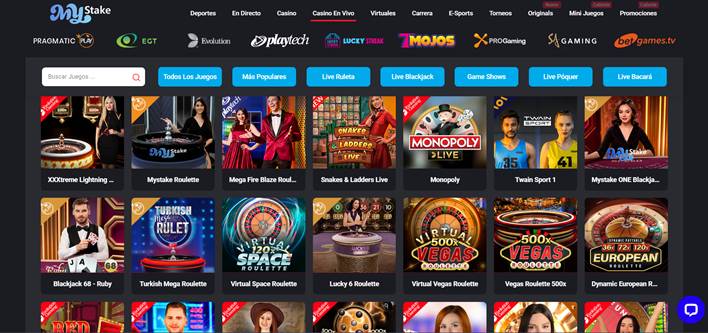 • Juegos de mesa. Los juegos de Mystake Casino en vivo están a cargo de proveedores como Pragmatic Play o Evolution, y también incluyen múltiples títulos exclusivos como la divertida Mystake Roulette.