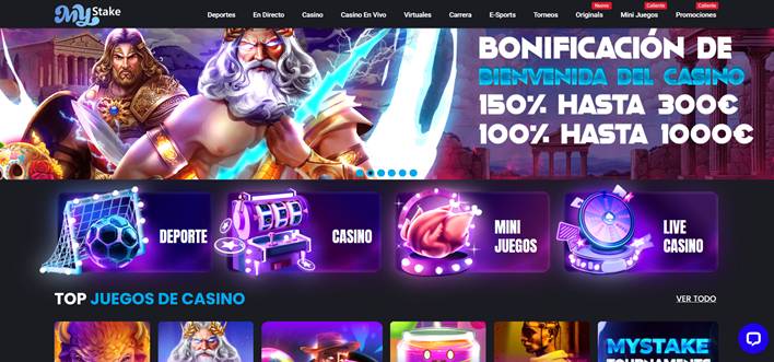 ¿Qué dirías si ponemos a tu disposición un casino con un bono de bienvenida de 1000 €, un sinfín de tragaperras exclusivas, y la posibilidad de cargar tu saldo con Tether? ¡Eso es justo lo que te ofrece Mystake Casino! Descubre a continuación uno de los mejores casinos online disponibles en España, ¡y no te pierdas todas sus ventajas!